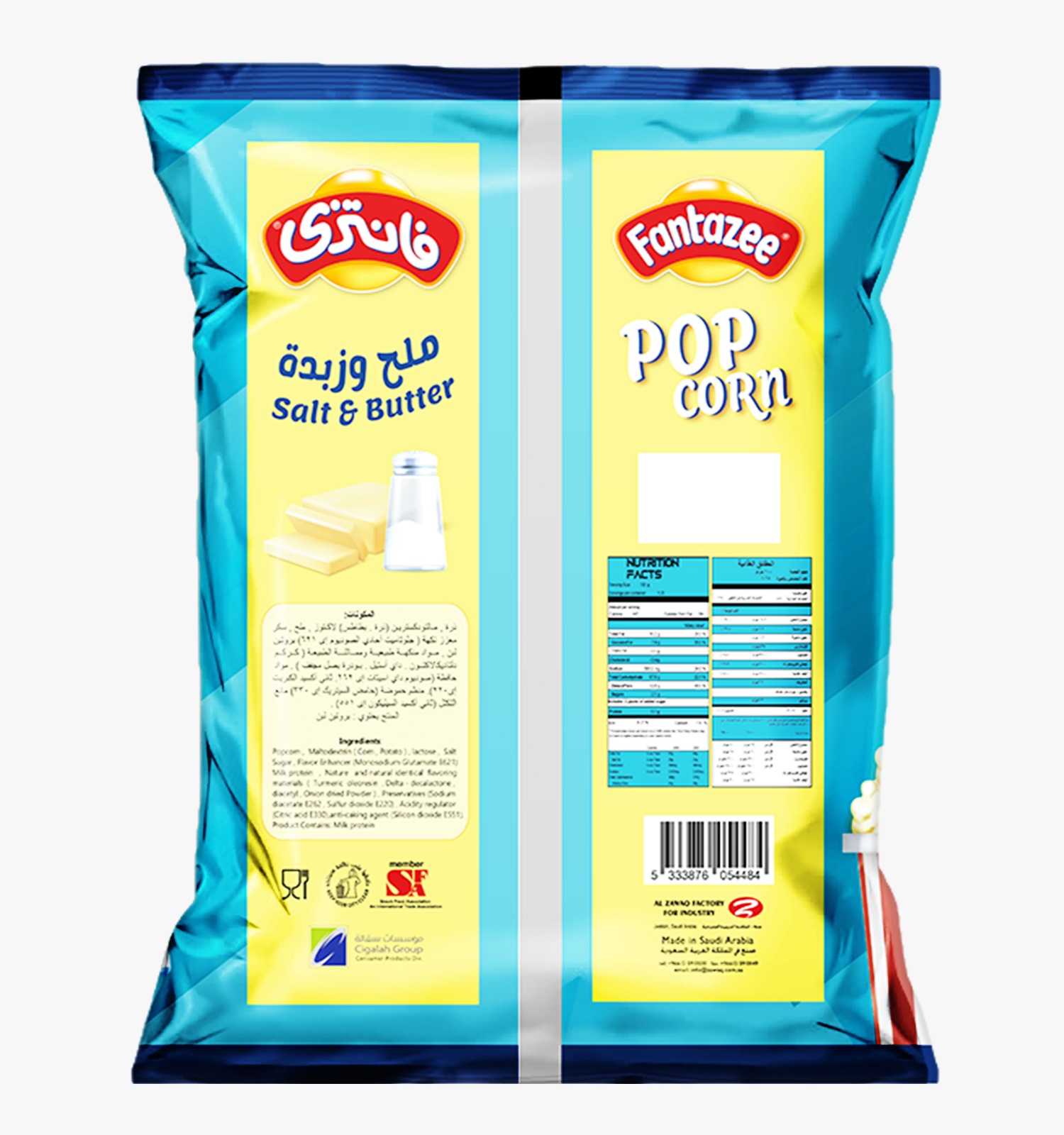 منتج مصنوع من حبوب الفشار. بطعم الملح والزبدة. متوفر بأحجام مختلفة : 20 جرام ، 75 جرام